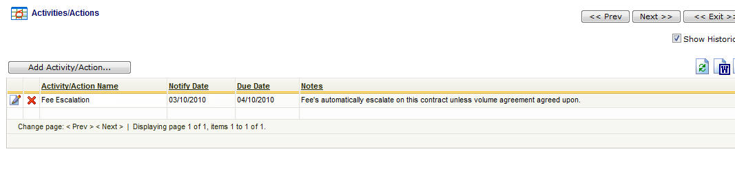 View/Edit Grid Button (pencil) - Click this next to the applicable activity/action in order to change any of the information relevant to the contract activity/action.